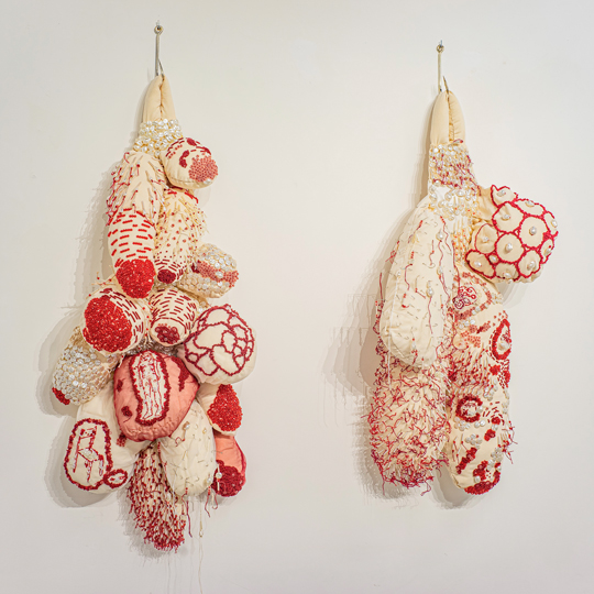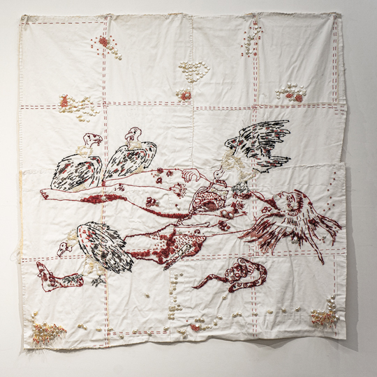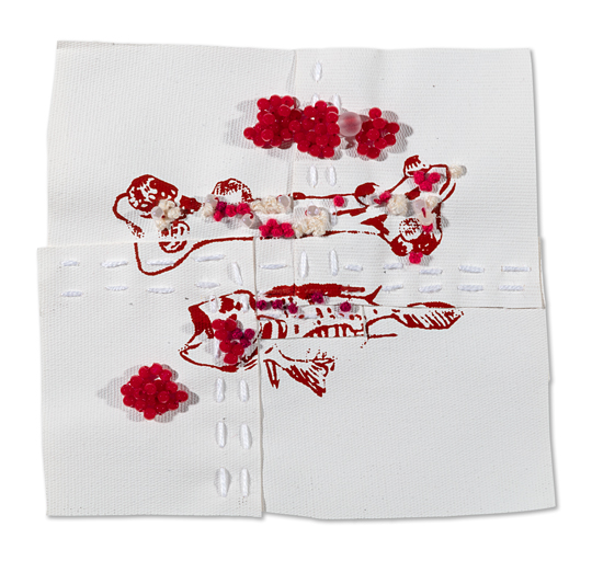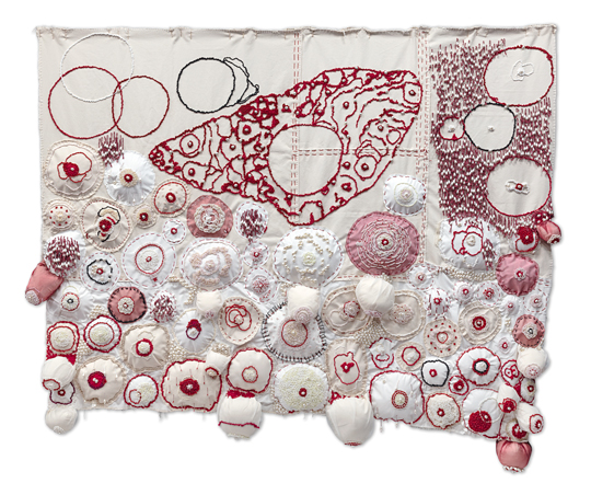 [embroidery, sewing, and beads on silkscreen print on canva]