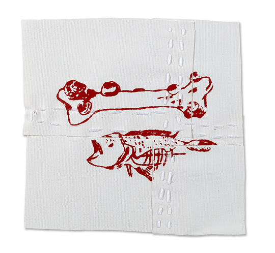 Costura e miçangas sobre impressão serigrafia em tecido de algodão cru [sewing and beads on silkscreen print on raw cotton fabric]